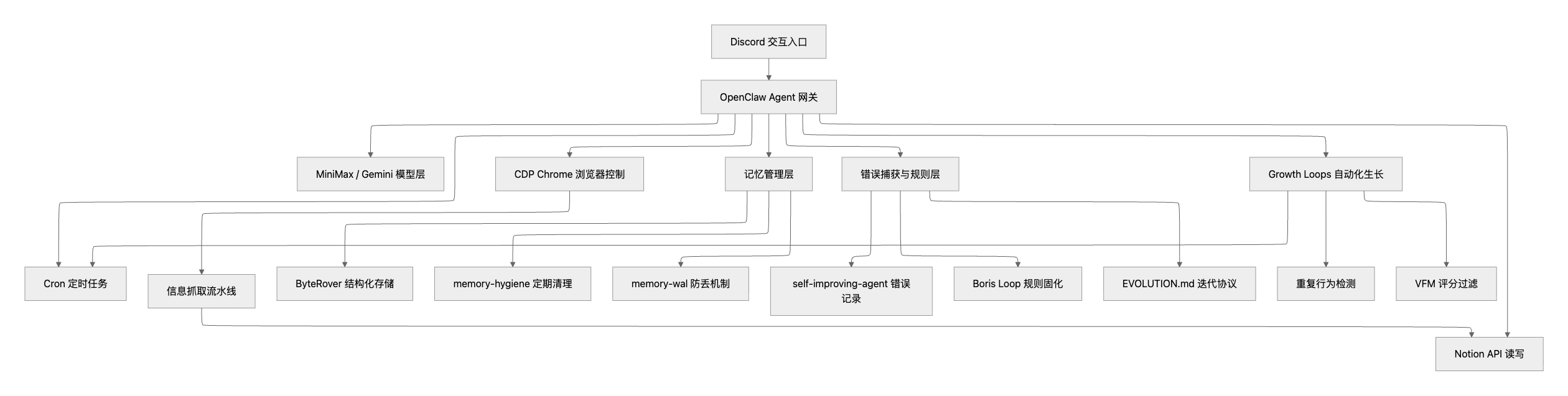 环境就是一台 Mac Mini M1 16GB,OpenClaw 本地部署,模型用 MiniMax + Gemini,Discord 和飞书做交互入口。最近加了微信,但效果不是很好,卡片和表格效果渲染不出来。