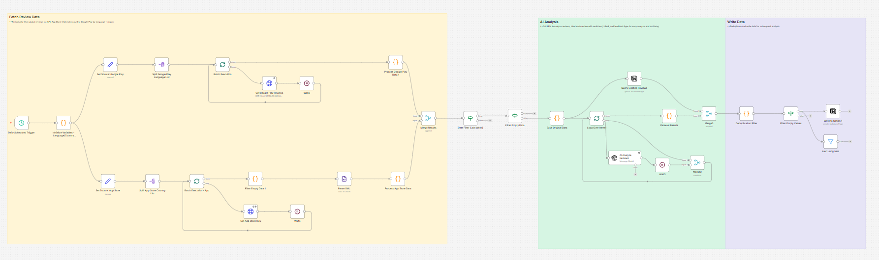 三条数据流——App Store 评论(RSS Feed,覆盖 175 个国家)、Google Play 评论(API,76+ 种语言)、用户邮件反馈(Google Sheets 中转)——每天凌晨自动触发,汇入同一套分析管道。